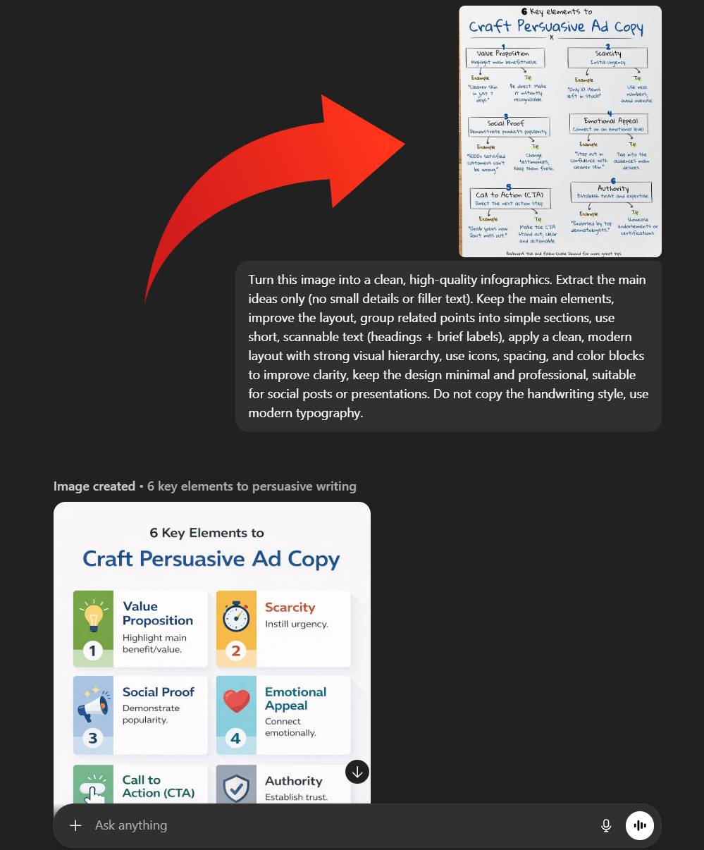 In partnership with OutSkill & Growth School: Turn AI Into Your Competitive Advantage in just 2 Days (Costs $0)AI isn’t coming for jobs. It’s coming for people who don’t know how to use it. AI is creating 170M new jobs while erasing 92M old ones. The biggest career advantage in 2026? Knowing how to work WITH AI instead of competing against it. Outskill's 16-hour LIVE training teaches you AI in just 2 days - the skill that makes you smarter, faster, more revenue-driven, and irreplaceable. This is your career insurance policy for 2026 - giving you the tools and workflows AI can't replace. You'll also get the 2026 AI Survival Handbook to navigate this year's AI breakthroughs. Secure Your Free Spot Now - It’s 100% FREE for the next 48 hours. 🧠 Live Sessions: Saturday & Sunday 🎁 $5,000+ in AI bonuses (for attendees): 📚 Prompt Bible, 💰 AI Monetization Roadmap, ⚙️ Personalized AI Toolkit Builder. 🤑 Build a $5,000/Month Online Business Without Clients (Step-By-Step Guide)Start an online business that pays you monthly without creating products. Most people think starting a business means huge investments and tech skills. They get overwhelmed trying to build something from scratch with no guaranteed income. This guide shows you how to automate marketing for small businesses using AI. Learn to earn monthly commissions by solving real business problems. (It’s perfect for beginners who want guaranteed recurring income.) You'll discover: → How to pick businesses that desperately need your help Start your recurring income business today. Read the guide, help your first business, and watch your monthly income grow! 💰 ChatGPT Prompts to Find a Job FastConnection Message Creator Write a personal message for [Target Professional] using the "give first principle" by offering valuable industry insight or a helpful resource before asking for anything. Mention their recent company achievement or shared connection. Present with response probability scores and an optimal timing guide. My resume: [Paste Resume]. Application Email Builder Write a direct email to [Hiring Manager] using the "executive communication style" with research on their background and recent company wins. Show immediate value through specific examples. Include curiosity-gap subject lines. My resume: [Paste Resume]. Job description: [Paste Job Description]. ChatGPT Prompts to Learn 10X FasterSkill Development Plan Develop a clear plan for mastering [subject or skill]. Organize it in a table format with steps, resources, and checkpoints. Each step should include actionable tasks, recommended resources (books, courses, tools), and key milestones. Ensure the plan is practical and concise to facilitate steady progress and mastery. Spaced Repetition Creator Develop a spaced repetition schedule for learning [topic]. Break the topic into key concepts. Create a 30-day calendar showing when to review each concept, increasing intervals between reviews. Present as a calendar grid with color-coded concepts. ChatGPT Prompts to Double Your ProductivityConcept Illustration Optimizer Create an illustration for [complex concept] that simplifies it using straightforward explanations and visual analogies. Incorporate everyday examples to make the concept relatable and accessible to everyone. Present it in clear, concise descriptions paired with visual elements that effectively convey the concept in an accessible manner. Productivity Framework Planner Design a personalized productivity framework for [Project description] that aligns with my goals and responsibilities. Include methods for task prioritization, time blocking, and maintaining focus. Provide a detailed, practical guide that I can implement to enhance productivity and achieve project objectives. How to Convert Handwritten Notes Into Polished Infographics With ChatGPTTurn rough ideas or hand-drawn sketches into polished visuals you can use in presentations, posts, or designs. Here’s how to do it (step-by-step): 👇 Step 1: Open ChatGPT and click the “+” button → choose “Add photos & files.” Step 2: Upload your sketch, diagram, or rough visual and click “create image.” Step 3: Paste this prompt: “Turn this image into a clean, high-quality infographic. Extract the main ideas only (no small details or filler text). Keep the main elements, improve the layout, group related points into simple sections, use short, scannable text (headings + brief labels), apply a clean, modern layout with strong visual hierarchy, use icons, spacing, and color blocks to improve clarity, keep the design minimal and professional, suitable for social posts or presentations. Do not copy the handwriting style; use modern typography.” Step 4: Review the image or ask ChatGPT to adjust style, layout, or color details. 💡 Quick Tip: You can sketch thumbnails, diagrams, or content layouts, and ChatGPT will turn them into publish-ready visuals. New AI Tools to Boost Your Productivity: