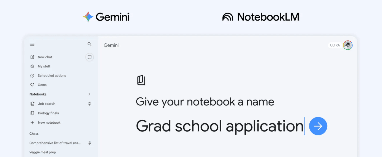 Google introduced notebooks in the Gemini app, a dedicated space to organize chats and files that syncs across Gemini and NotebookLM for easier project tracking.